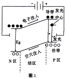 发光二极管是由Ⅲ-Ⅳ族化合物,如GaAs(砷化镓)、GaP(磷化镓)、GaAsP(磷砷化镓)等半导体制成的,其核心是PN结。因此它具有一般P-N结的I-N特性,即正向导通,反向截止、击穿特性。此外,在一定条件下,它还具有发光特性。在正向电压下,电子由N区注入P区,空穴由P区注入N区。进入对方区域的少数载流子(少子)一部分与多数载流子(多子)复合而发光,如图1所示。