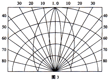 图3给出的二只不同型号发光二极管发光强度角分布的情况。中垂线(法线)AO的坐标为相对发光强度(即发光强度与最大发光强度的之比)。显然,法线方向上的相对发光强度为1,离开法线方向的角度越大,相对发光强度越小。由此图可以得到半值角或视角值。