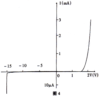 (7)V-I特性:发光二极管的电压与电流的关系可用图4表示。在正向电压正小于某一值(叫阈值)时,电流极小,不发光。当电压超过某一值后,正向电流随电压迅速增加,发光。由V-I曲线可以得出发光管的正向电压,反向电流及反向电压等参数。正向的发光管反向漏电流IR<10μA以下。