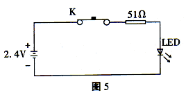 (1)利用高亮度或超高亮度发光二极管制作微型手电的电路如图5所示。图中电阻R限流电阻,其值应保证电源电压最高时应使LED的电流小于最大允许电流IFm。