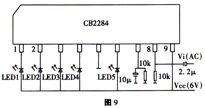 (5)电平表。目前,在音响设备中大量使用LED电平表。它是利用多只发光管指示输出信号电平的,即发光的LED数目不同,则表示输出电平的变化。图9是由5只发光二极管构成的电平表。当输入信号电平很低时,全不发光。输入信号电平增大时,首先LED1亮,再增大LED2亮……。