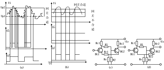 (2)如图2(C)电路加入RE1可使UP1增加,从而使回差减小;或如图2(d)电路加入RE2,可使Ic2减小从而使Up2减小,缩小回差。但这种方法会削弱正反馈作用而降低翻转速度,如在RE1或RE2并联一只小电容,就可避免这种影响。