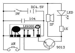 B:通电后AN没有闭合,电路处于待机状态,当按下AN后,触发端得到触发信号,LX9300输出端输出“叮咚”的音乐信号输入到三极管9013放大,推动喇叭发声,同时并联在喇叭上的LED发光,1K的电阻为LED的限流电阻。当响完三次后,又回到待机状态,等待下一次触发.