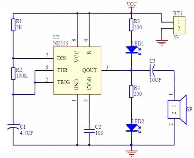 <电路工作原理:电路中的R1、R2、C1、C2和NE555组成一个定时器电路,通电后,NE555的第3管脚就会输出高低电平组合的方波信号。为了方便初学者理解,我们把高电平和低电平分别看做是5V电压和0V电压,再看两个LED和蜂鸣器的接线,R2和R4都是限流电阻,当NE555的第3管脚输出高电平,LED2点亮,LED1熄灭,电容C3被充电,蜂鸣器发出“嘀”的声音,当第3管脚输出低电平,LED1点亮,LED2熄灭,电容C3通过蜂鸣器放电,发出“嗒”的声音,由于电平信号电流很小,蜂鸣器发出的声音很小。所以定时器不断的产生方波信号,两个LED就不断的交替闪烁,蜂鸣器也发出“嘀嗒”的节拍声。改变R1、R2或者C1的值,就可以改变定时器电路发出的方波信号频率,也就可以改变LED闪烁的频率。>