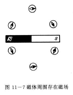 先在桌上放一圈小磷针,再把一个条形磁体放到小磁针中间,观察小磁针的指向有什么变化。实验结果如图11-7所示,小磁针静止时都不再指南北,而有了新的指向。这是怎么回事?