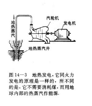 自然界存在的潮汐能、地热能(图14-3)也还没有充分利用。随着人类日益深入地认识自然本世纪还发现了核能。煤、石油、天然气以及水能等能源,人类已经利用多年,叫做常规能源。核能、太阳能、潮汐能、地热能等能源,叫做新能源。开发和利用新能源,特别是核能和太阳能,是解决能源问题的主要出路。